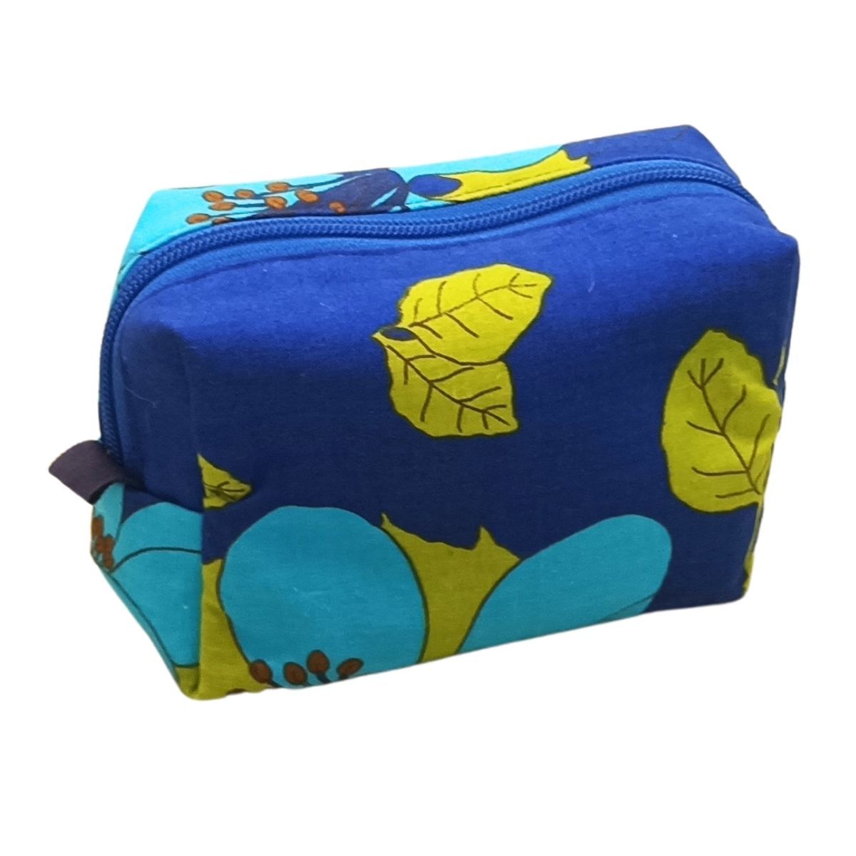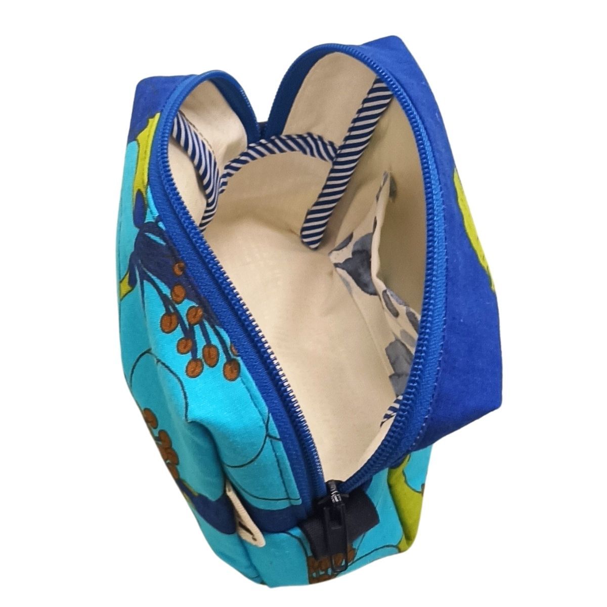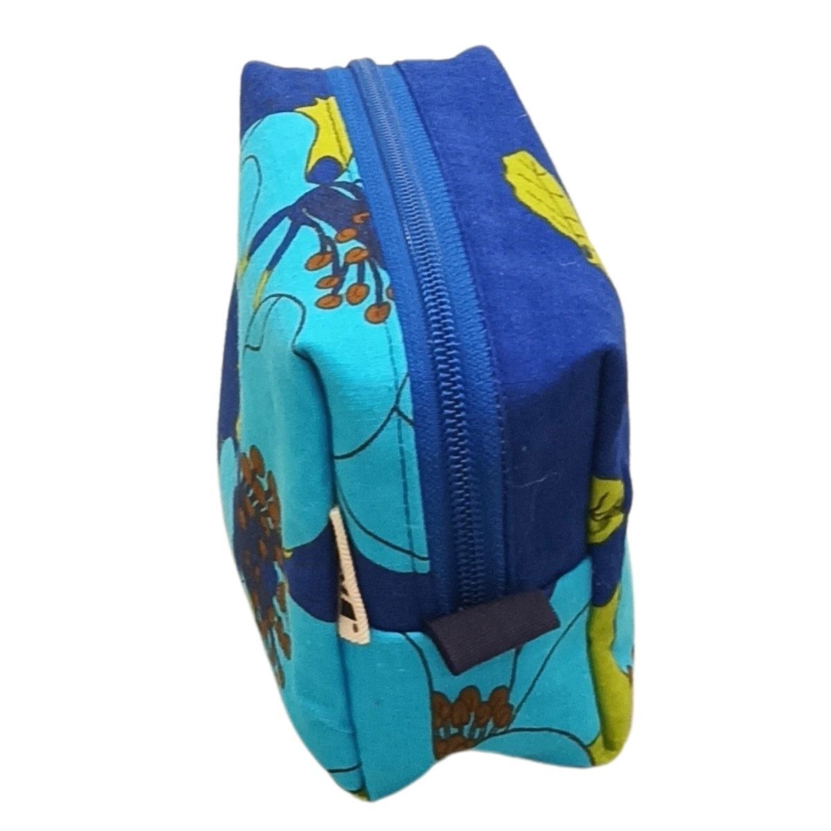 Vanhasta pöytäliinasta valmistettu meikkipussukka. Sisällä pieni avotasku esim pinnejä tai laastareita varten. Sisältä meikkipussukka on vettähylkivää polyesterkangasta, joka on helppo vain pyyhkiä puhtaaksi mikäli esimerkiksi nestemäinen meikkivoide sattuu avautumaan itsestään… Kooltaan noin 16 cm leveä, 10cm korkea ja 8cm syvä.